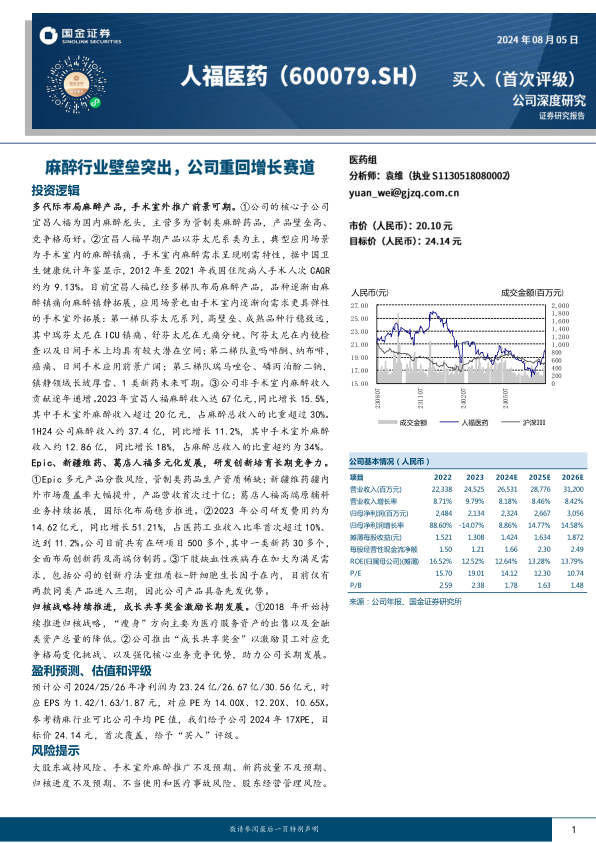 本报告分析了人福医药的投资逻辑,强调了其在麻醉产品领域的优势和多元化发展战略。宜昌人福的多代际麻醉产品布局和手术室外推广,以及Epic、新疆维药、葛店人福的多元化发展,为公司带来了增长潜力。此外,公司在研发创新方面的投入,特别是重组质粒-肝细胞生长因子注射液的研发,有望为公司带来重磅单品。综合考虑,本报告给予人福医药“买入”评级。