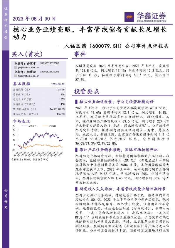 人福医药2023年上半年业绩表现稳健,核心业务持续放量,子公司经营向好,海外市场拓展取得积极进展。