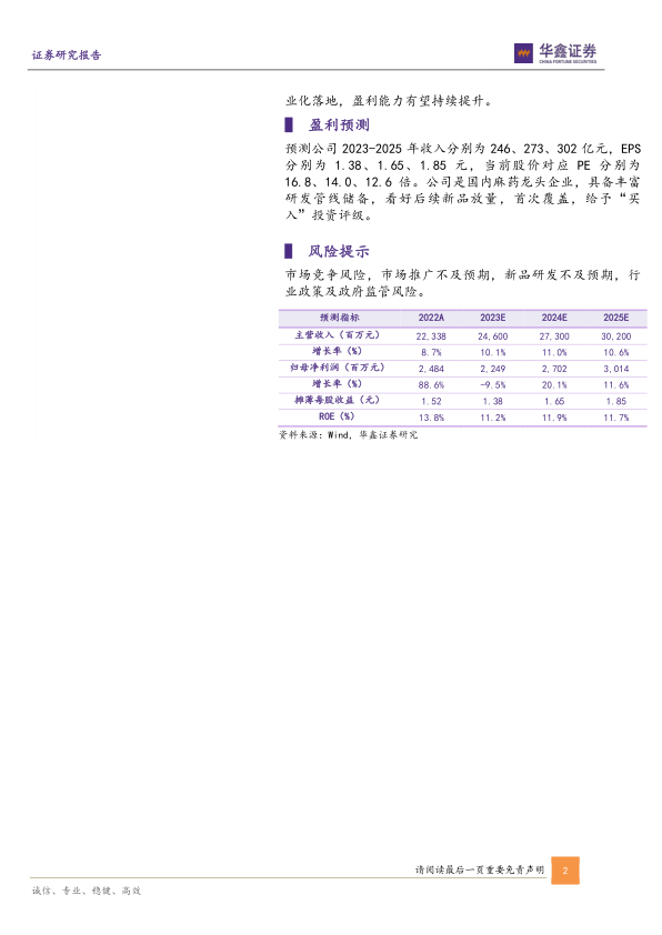 预测公司2023-2025年收入分别为246、273、302亿元,EPS分别为1.38、1.65、1.85元,当前股价对应PE分别为16.8、14.0、12.6倍。公司是国内麻药龙头企业,具备丰富研发管线储备,看好后续新品放量,首次覆盖,给予“买入”投资评级。
