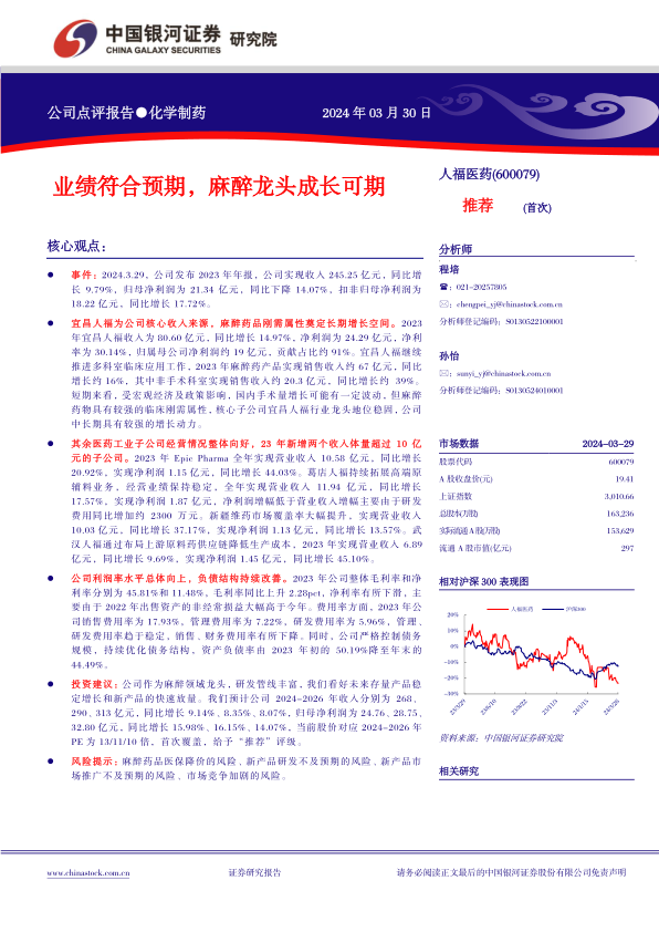 投资建议:公司作为麻醉领域龙头,研发管线丰富,我们看好未来存量产品稳定增长和新产品的快速放量。我们预计公司2024-2026年收入分别为268、290、313亿元,同比增长9.14%、8.35%、8.07%,归母净利润为24.76、28.75、32.80亿元,同比增长15.98%、16.15%、14.07%,当前股价对应2024-2026年PE为13/11/10倍,首次覆盖,给予“推荐”评级。