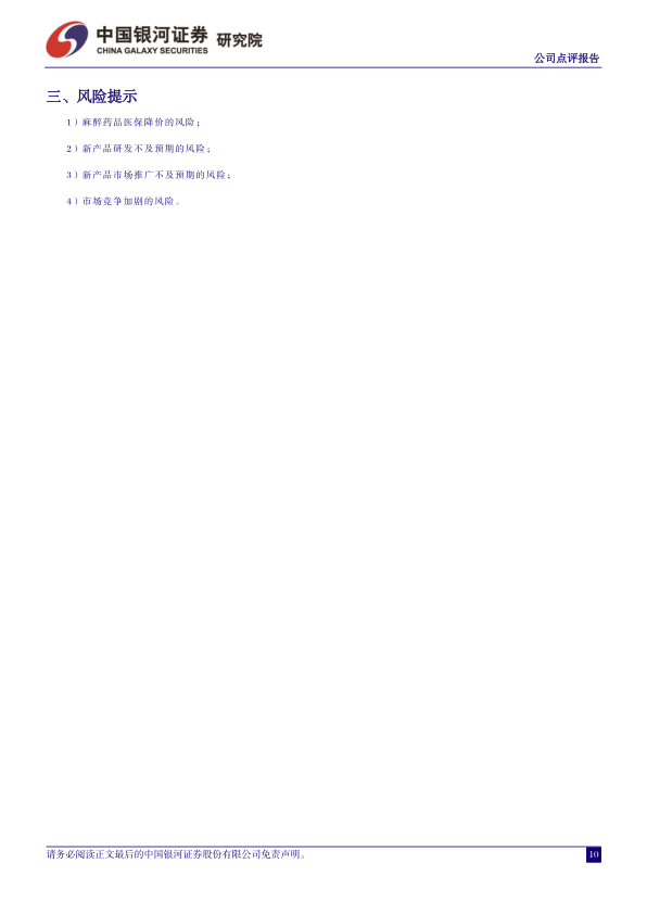 风险提示:麻醉药品医保降价的风险、新产品研发不及预期的风险、新产品市场推广不及预期的风险、市场竞争加剧的风险。