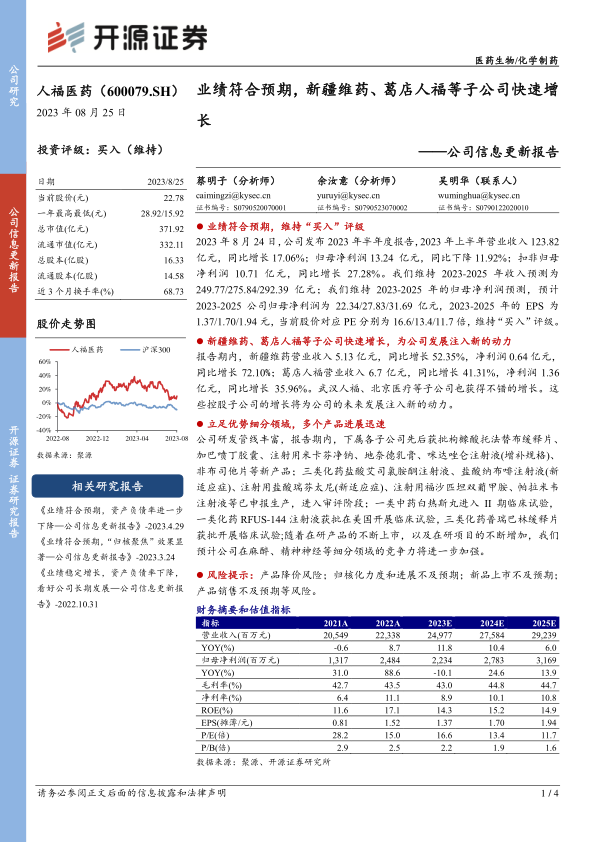 新疆维药、葛店人福等子公司快速增长,为公司发展注入新的动力