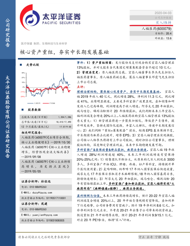 本报告的核心观点是人福医药通过核心资产重组,理顺治理结构,聚焦优质麻醉业务,夯实中长期发展基础。具体包括: