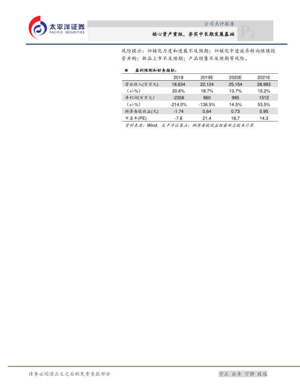 人福医药通过本次核心资产重组,有望理顺治理结构,聚焦核心优质麻醉业务,提升盈利能力。宜昌人福业绩增长强劲,多科室推广和新药获批将驱动麻药业务持续提速。维持“买入”评级,但需关注归核化进展、新品上市及产品销售等风险。