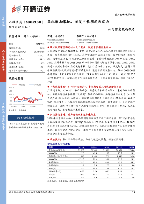 人福医药通过实施股权激励计划,有效绑定了核心员工利益,为公司中长期发展注入强劲动力。在核心业务方面,公司凭借“大麻药”产品线的持续丰富和多科室推广策略的成功实施,预计宜昌人福将实现快速增长。同时,公司坚定推进归核化战略,通过剥离非核心资产显著优化了资产负债结构,降低了财务费用,财务健康状况有望加速修复。尽管存在核心品种降价、归核化及研发进度不及预期等风险,但综合来看,公司在麻醉细分领域的龙头地位、清晰的增长路径和持续改善的财务状况,使其具备较高的投资价值,维持“买入”评级。