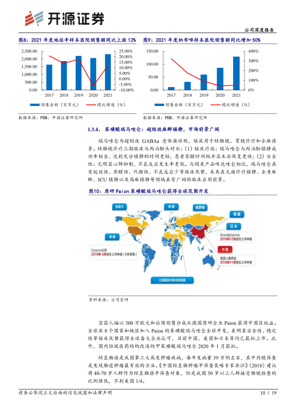 公司凭借麻醉镇痛(芬太尼系列、氢吗啡酮、纳布啡等)打造了国内最强麻醉用药研发平台和专业学术推广体系,奠定了麻醉领域龙头地位;同时积极向麻醉镇静领域拓展,有望凭借1类新药瑞马唑仑、磷丙泊酚和强大销售网络实现麻醉镇静领域超车;此外与华西医院合作布局长效局麻创新药和新型骨骼肌松药物,麻醉镇静领域公司有望完成从跟随到领跑的转变。宜昌人福芬太尼系列受益多科室推广和手术量增加,持续稳定增长,纳布啡和氢吗啡酮在术后镇痛和麻醉镇痛领域渗透率快速提升,新产品瑞马唑仑和阿芬太尼有望成为门诊检查和日间手术最佳的用药选择。