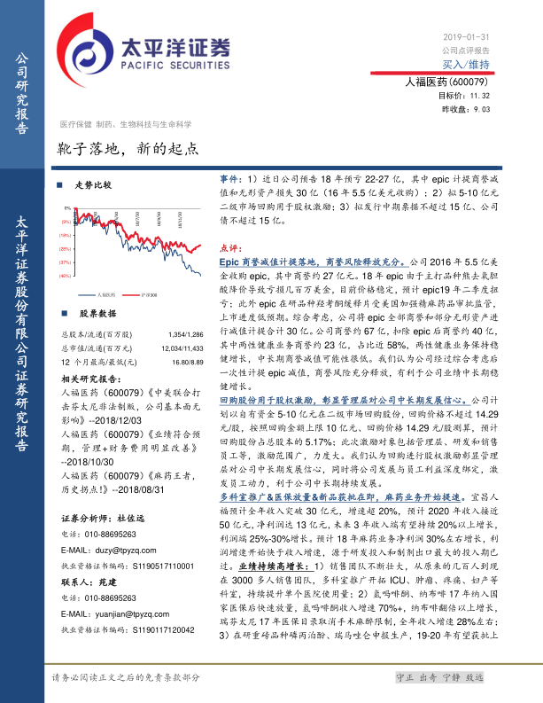 人福医药通过一次性计提Epic商誉减值30亿元,有效释放了商誉风险,并计划通过5-10亿元的股份回购进行股权激励,此举凸显了管理层对公司未来发展的坚定信心。公司核心麻药业务在多科室推广、医保放量及新品获批的驱动下,预计未来三年将保持20%-30%的收入和利润增长。结合归核化战略带来的财务费用降低,公司预计2019年将实现业绩反转,并在未来两年内展现出显著的增长潜力,合理估值显示其市值有望翻倍。基于此,报告维持“买入”评级,并设定目标价11.32元。