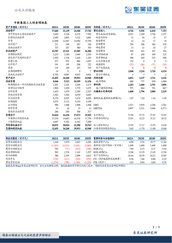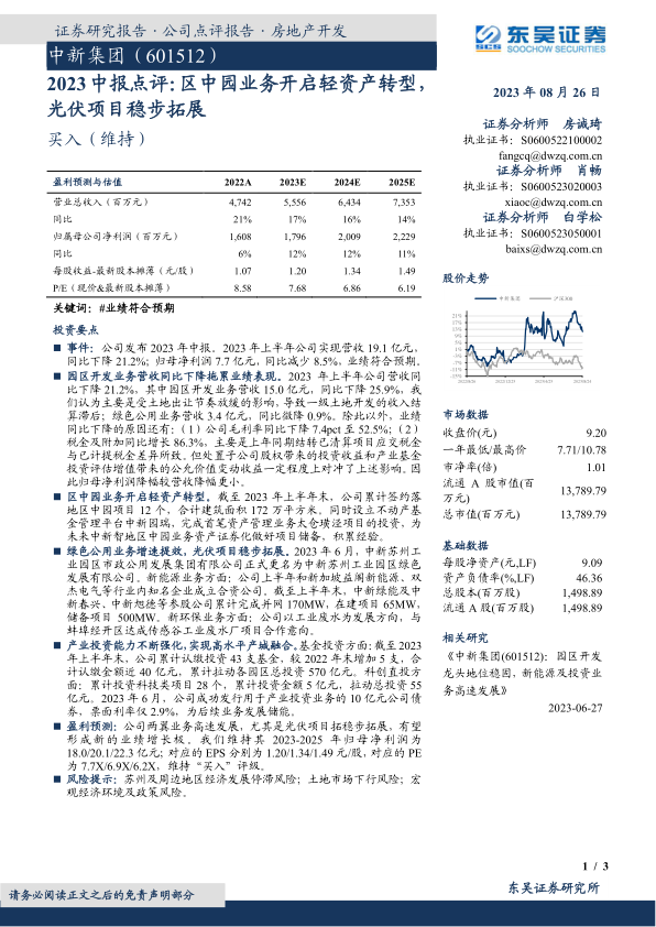 中新集团2023年中报显示,公司业绩符合预期。报告维持对公司2023-2025年归母净利润的预测,分别为18.0/20.1/22.3亿元,对应的EPS分别为1.20/1.34/1.49元/股,对应的PE为7.7X/6.9X/6.2X,维持“买入”评级。
