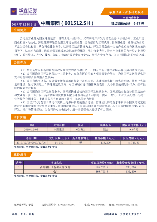 本报告对中新集团(601512.SH)进行了新股询价分析,基于公司多元化的业务模式、中新合作的独特优势、综合资源整合能力、规划设计优势以及经验丰富的管理团队,建议询价价格为9.67元。募集资金将主要用于斜塘项目的基础设施改造。报告旨在为投资者提供参考,但投资者应结合自身情况进行独立判断。