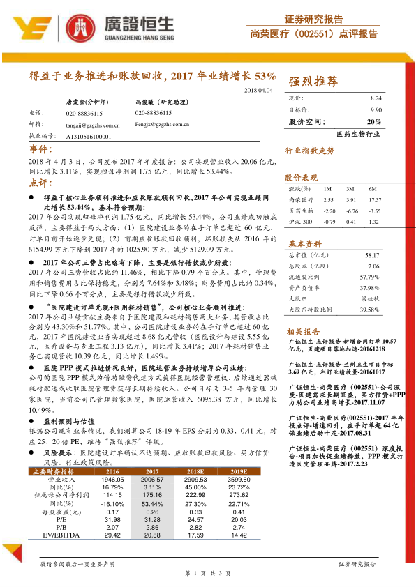 本报告的核心观点是,尚荣医疗2017年业绩增长53%,主要得益于核心业务的顺利推进和应收账款的有效回收。公司医院建设业务订单充足,且PPP模式运营良好,为未来业绩增长奠定基础。