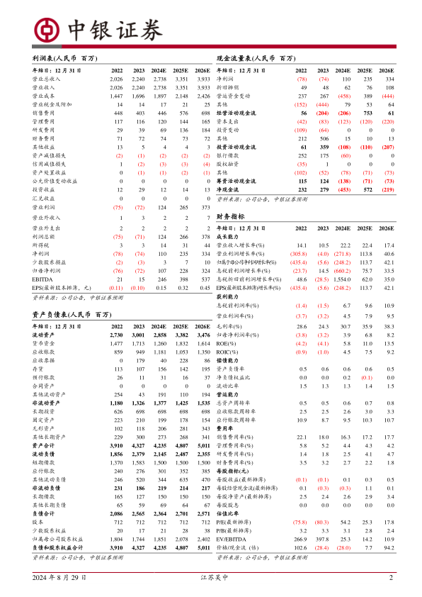 预期公司2024年、2025年、2026年归母净利润为1.07亿元、2.28亿元和3.24亿元,对应EPS分别为0.15元、0.32元和0.45元,根据2024年8月28日收盘价市盈率分别为54.2、25.3倍和17.8倍。维持买入评级。