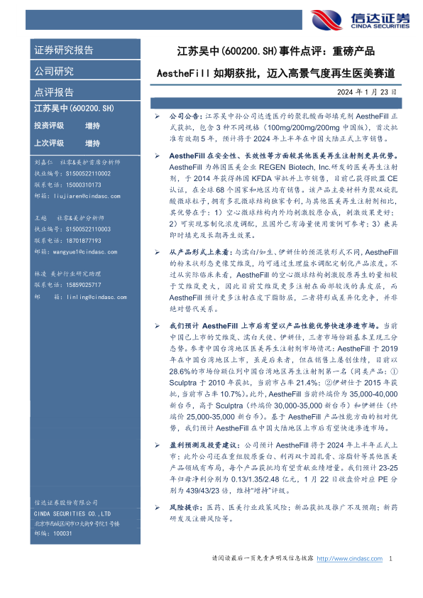 公司公告: 江苏吴中孙公司达透医疗的聚乳酸面部填充剂 AestheFill 正式获批,包含 3 种不同规格(100mg/200mg/200mg 中国版),首次批准有效期 5 年, 预计将于 2024 年上半年在中国大陆正式上市销售。