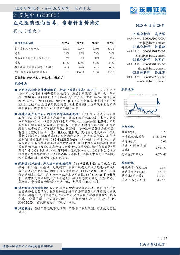 盈利预测与投资评级:公司医药产品和产业链布局完善,通过内生外延医美业务也蓄势待发,童颜针和玻尿酸等产品有望在未来陆续获批贡献新的利润增长。我们预计公司2023~25年分别实现归母净利润0.2/1.3/2.6亿元,分别同增127%/513%/103%,当前市值对应2023~25年PE316/52/25X,首次覆盖给予“买入”评级。