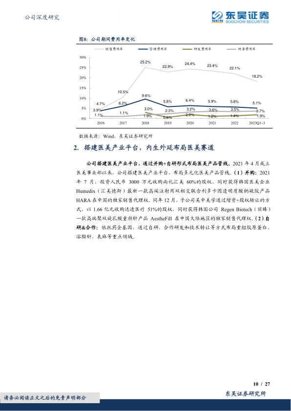 搭建医美产业平台,内生外延布局医美赛道:2021年4月成立医美事业部以来,公司搭建医美产业平台,并且不断扩充在研发、生产、销售方面的核心人才,推动医美管线全面布局。(1)Aesthefill童颜针:采用聚双旋乳酸成分&空心微球专利技术,定位再生材料高端市场,具有刺激再生效率较高、可多浓度复配、速溶性、安全性等显著差异化优势,有望于2024Q1获批。(2)HARA玻尿酸:艾莉薇的迭代新品,使用最新交联技术,拥有更高的安全性和稳定性,处于临床阶段,有望于2024Q1提交注册申请。(3)重组胶原蛋白:内外并进,外部和浙大、东万生物以及美国企业达成技术合作或引进,内部中凯生物制药拥有重组蛋白药物产业化经验,溶液和植入剂处于临床前阶段,敷料自有品牌“婴芙源”于2022年上市。(4)溶脂针:发展潜力较大,2022年已完成立项工作,在临床前阶段。(5)利丙双卡因乳膏:依托吴中医药团队研发,处于临床阶段,有望于2025年获批。