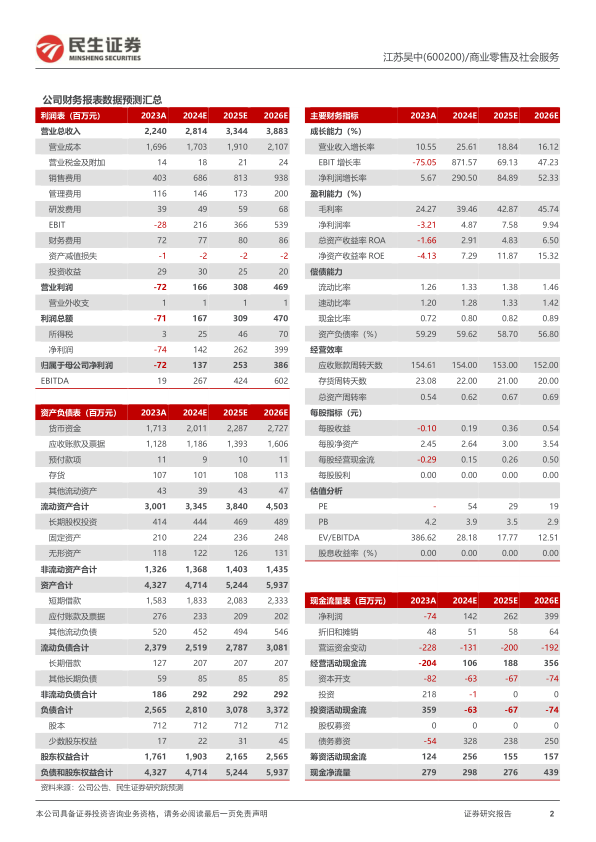 民生证券研究院预测,江苏吴中凭借其深厚的药企基因和在医美业务上的发力布局,有望在高成长赛道拉动整体利润上行。预计公司2024年至2026年将分别实现营业收入28.14亿元、33.44亿元和38.83亿元,同比增速分别为25.6%、18.8%和16.1%,保持稳健增长。归母净利润预计将分别达到1.37亿元、2.53亿元和3.86亿元,对应2024年至2026年的PE分别为54倍、29倍和19倍,显示出未来盈利能力的显著改善和增长潜力。基于此,民生证券维持对江苏吴中“谨慎推荐”的投资评级。