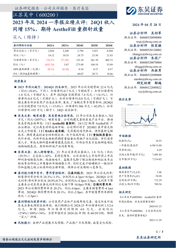本报告对江苏吴中进行了深入分析,公司短期业绩承压,但医美业务的快速发展和医药业务的稳定增长,为公司未来的发展奠定了基础。AestheFill童颜针的上市有望成为公司业绩增长的重要驱动力。维持“买入”评级,表明了对公司未来发展前景的信心。