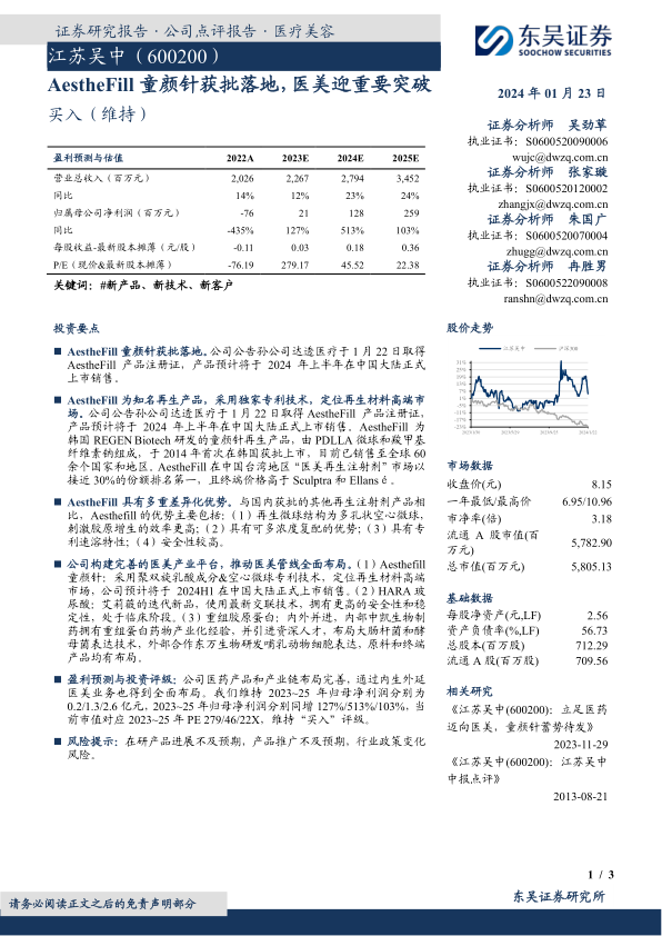 报告维持对江苏吴中的“买入”评级,主要基于公司完善的医药产品和产业链布局,以及医美业务的全面发展。通过对公司未来盈利能力的预测,进一步验证了公司良好的发展前景。