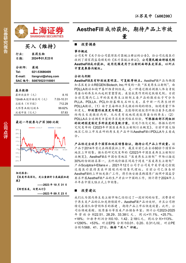 产品经过全球多个国家和地区销售验证,期待公司产品上市放量。该产品于2014年首次在韩国获批上市,截至目前已在全球60余个国家和地区上市销售。据头豹研究院发布的《2023年中国医美再生注射剂行业概览》,AestheFill在中国台湾地区“医美再生注射剂”市场以接近30%的份额排名第一,且终端价格区间高于同类“医美再生注射剂”产品Sculptra和Ellansé。2021年12月公司子公司吴中美学通过控股达透医疗获得其在中国境内的销售代理权。目前公司已准备好AestheFill的上市相关推广工作,将尽快安排其韩国原厂按照中国监管要求开展AestheFill产品的生产并出口中国的工作,预计将于2024年上半年在中国大陆正式上市销售。