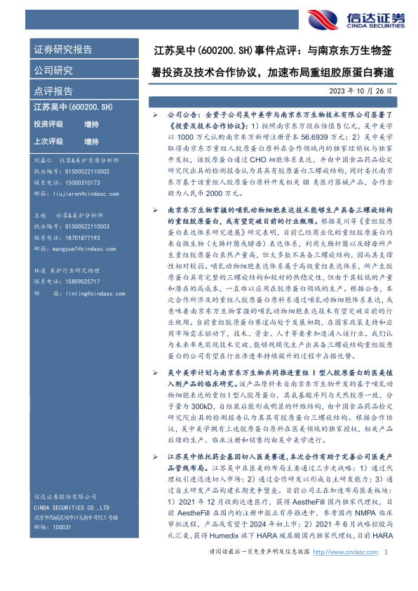 公司公告:全资子公司吴中美学与南京东万生物技术有限公司签署了《投资及技术合作协议》:1)按照南京东万投后估值5亿元,吴中美学以1000万元认购南京东万新增注册资本56.6939万元;2)吴中美学取得南京东万重组人胶原蛋白原料在合作领域内的独家经销权与独家开发权,该胶原蛋白通过CHO细胞体系表达,并由中国食品药品检定研究院出具的检测报告认为其具有胶原蛋白三螺旋结构,同时委托南京东万基于该重组人胶原蛋白原料开发相关III类医疗器械产品,合作金额为人民币2000万元。