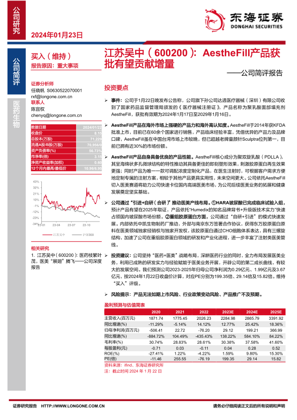 本报告通过对江苏吴中AestheFill产品获批事件的分析,突出了公司在医美领域的战略布局和发展潜力。AestheFill凭借其在海外市场的成功经验和独特的产品性能,有望为公司带来新的增长动力。同时,公司通过多元化的产品线布局,包括玻尿酸和重组胶原蛋白,进一步巩固了其在医美市场的地位。维持“买入”评级,反映了对公司未来盈利能力的乐观预期。