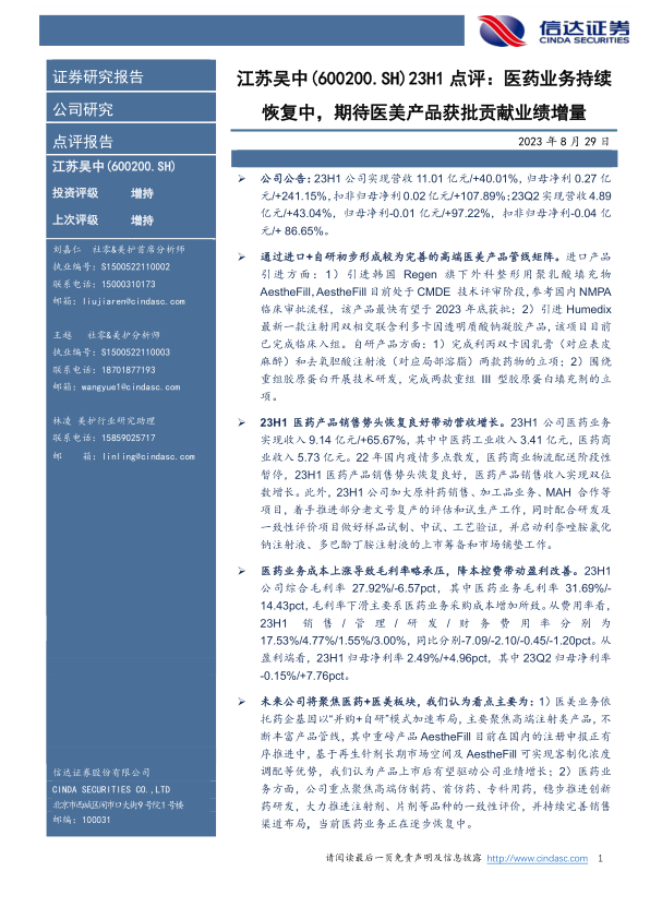 23H1点评:医药业务持续恢复中,期待医美产品获批贡献业绩增量