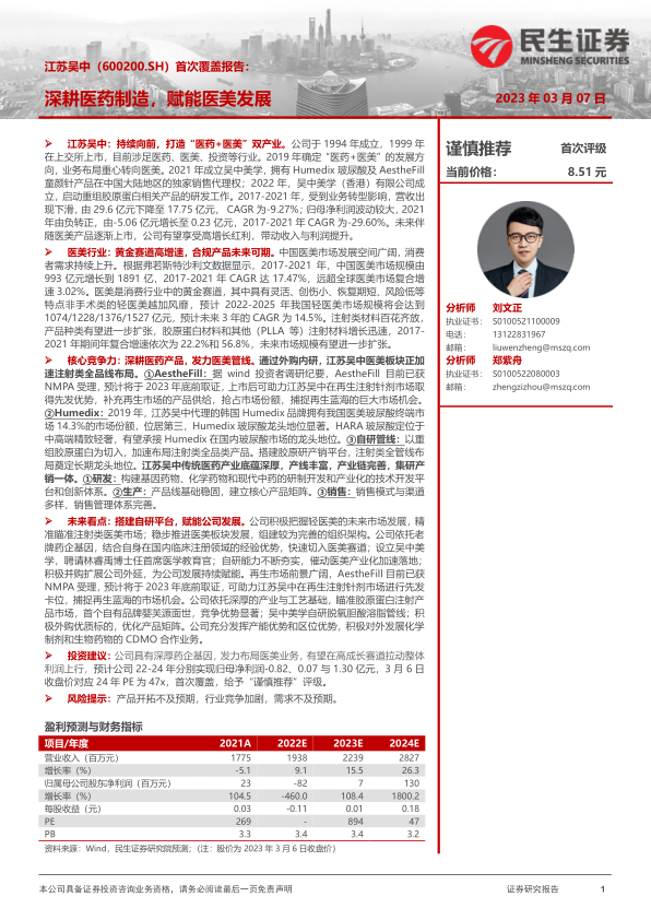 投资建议:公司具有深厚药企基因,发力布局医美业务,有望在高成长赛道拉动整体利润上行,预计公司22-24年分别实现归母净利润-0.82、0.07与1.30亿元,3月6日收盘价对应24年PE为47x,首次覆盖,给予“谨慎推荐”评级。