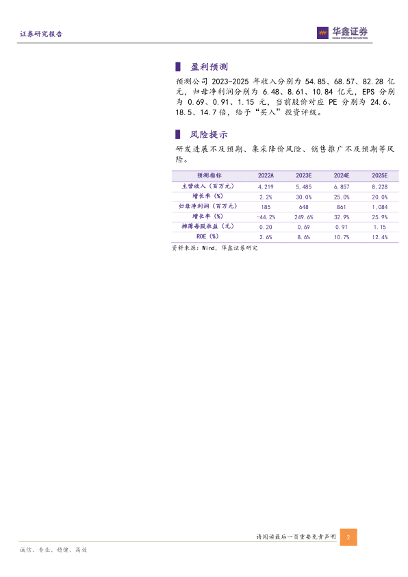 报告提示了可能影响公司业绩的风险因素,包括研发进展不及预期、集采降价风险以及销售推广不及预期等。这些风险可能对公司的未来盈利能力和市场表现造成不利影响。