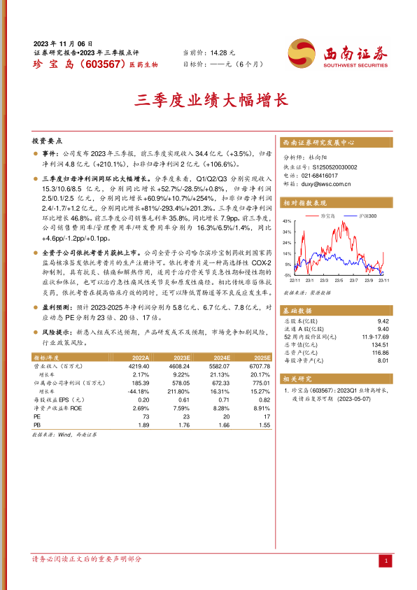 本报告对珍宝岛2023年三季报进行了全面分析,公司三季度业绩大幅增长,盈利能力显著提升。全资子公司依托考昔片获批上市,有望为公司带来新的增长点。维持公司盈利预测,但同时也提示了相关风险。