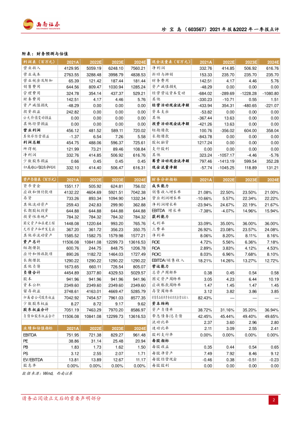 根据分析师预测,珍宝岛公司2022年至2024年的归母净利润将分别达到4.1亿元、5.1亿元和6.2亿元,对应的每股收益(EPS)分别为0.44元、0.54元和0.65元。基于此,对应估值分别为31倍、25倍和21倍。报告认为,公司中药注射液及口服制剂业务在政策利好下有望加速增长,同时投资特瑞思布局创新生物药国际化,使得公司未来发展值得期待。报告也提示了政策风险、行业竞争加剧以及新产品研发不达预期的风险。