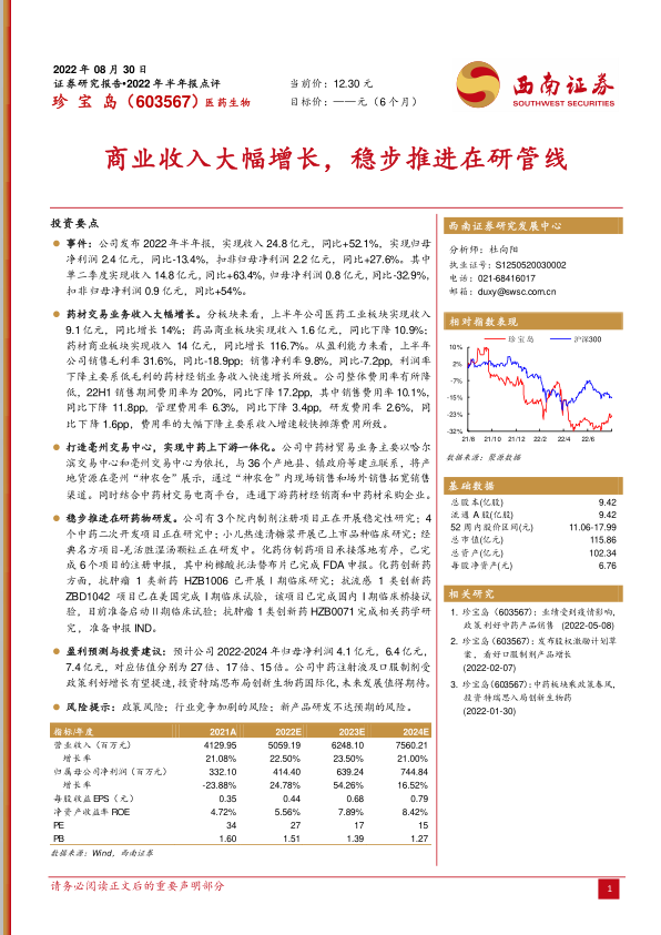 珍宝岛2022年上半年营收大幅增长主要得益于药材交易业务的快速扩张,但低毛利率业务占比提升导致整体盈利能力下降。公司正积极打造中药材业务一体化平台,并稳步推进在研药物的研发。受益于政策支持和创新药布局,公司未来发展潜力巨大,但同时也面临政策、竞争和研发等多重风险。预计未来几年公司净利润将保持增长,估值具有吸引力。