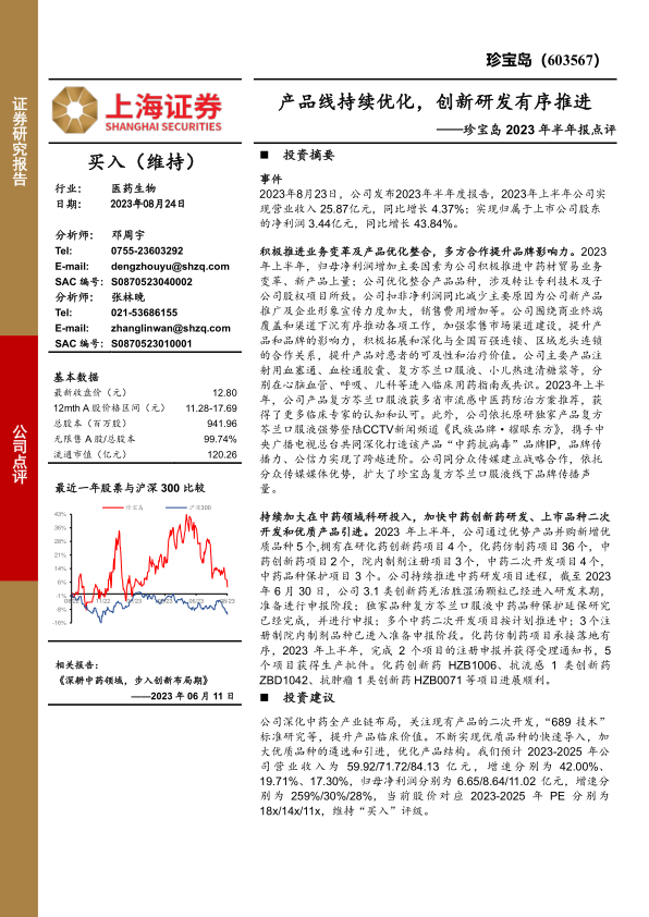 积极推进业务变革及产品优化整合,多方合作提升品牌影响力。2023年上半年,归母净利润增加主要因素为公司积极推进中药材贸易业务变革、新产品上量;公司优化整合产品品种,涉及转让专利技术及子公司股权项目所致。公司扣非净利润同比减少主要原因为公司新产品推广及企业形象宣传力度加大,销售费用增加等。公司围绕商业终端覆盖和渠道下沉有序推动各项工作,加强零售市场渠道建设,提升产品和品牌的影响力,积极拓展和深化与全国百强连锁、区域龙头连锁的合作关系,提升产品对患者的可及性和治疗价值。公司主要产品注射用血塞通、血栓通胶囊、复方芩兰口服液、小儿热速清糖浆等,分别在心脑血管、呼吸、儿科等进入临床用药指南或共识。2023年上半年,公司产品复方芩兰口服液获多省市流感中医药防治方案推荐,获得了更多临床专家的认知和认可。此外,公司依托原研独家产品复方芩兰口服液强势登陆CCTV新闻频道《民族品牌·耀眼东方》,携手中央广播电视总台共同深化打造该产品“中药抗病毒”品牌IP,品牌传播力、公信力实现了跨越进阶。公司同分众传媒建立战略合作,依托分众传媒媒体优势,扩大了珍宝岛复方芩兰口服液线下品牌传播声量。