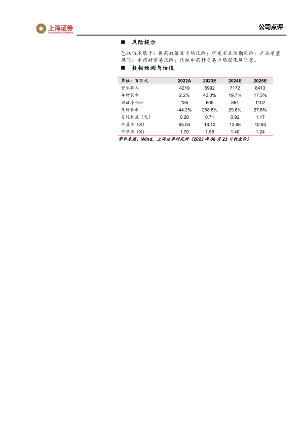 公司深化中药全产业链布局,关注现有产品的二次开发,“689技术”标准研究等,提升产品临床价值。不断实现优质品种的快速导入,加大优质品种的遴选和引进,优化产品结构。我们预计2023-2025年公司营业收入为59.92/71.72/84.13亿元,增速分别为42.00%、19.71%、17.30%,归母净利润分别为6.65/8.64/11.02亿元,增速分别为259%/30%/28%,当前股价对应2023-2025年PE分别为18x/14x/11x,维持“买入”评级。