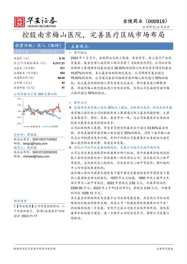 2024年1月3日,金陵药业发布公告,拟通过收购基金份额的方式间接持有南京梅山医院超过50%的股权,最终实现直接控股。