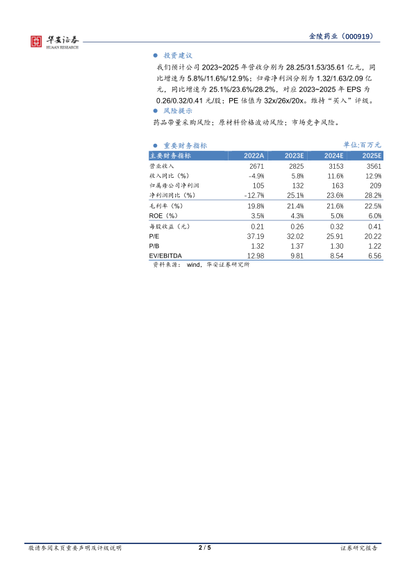报告提示了药品带量采购风险、原材料价格波动风险以及市场竞争风险。
