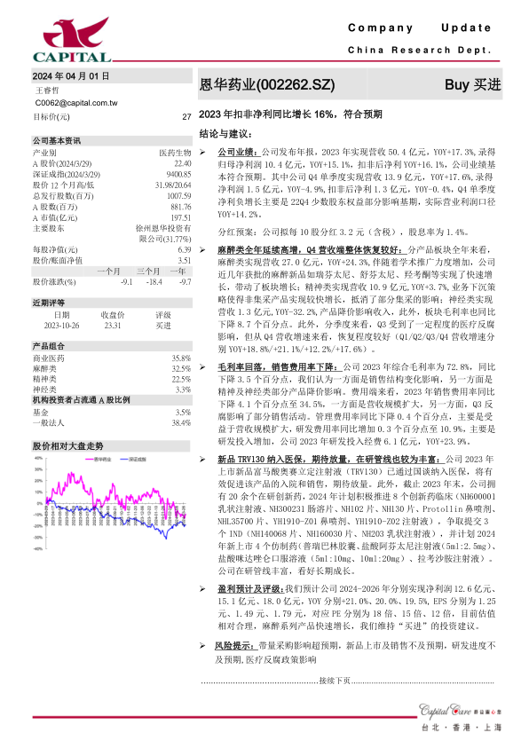 恩华药业2023年业绩符合预期,麻醉业务增长强劲,新品纳入医保,在研管线丰富。尽管面临带量采购和医疗反腐等风险,但考虑到公司在麻醉领域的优势和创新药的潜力,维持“买进”的投资建议。预计未来几年公司净利润将保持稳定增长。