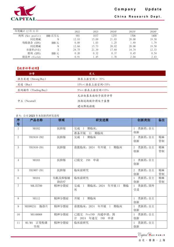 新品TRV130纳入医保,期待放量,在研管线也较为丰富:公司2023年上市新品富马酸奥赛立定注射液(TRV130)已通过国谈纳入医保,将有效促进该产品的入院和销售,期待放量。此外,截止2023年末,公司拥有20余个在研创新药,2024年计划积极推进8个创新药临床(NH600001乳状注射液、NH300231肠溶片、NH102片、NH130片、Protollin鼻喷剂、NHL35700片、YH1910-Z01鼻喷剂、YH1910-Z02注射液),争取提交3个IND(NH140068片、NH160030片、NH203乳状注射液),并计划2024年新上市4个仿制药(普瑞巴林胶囊、盐酸阿芬太尼注射液(5ml:2.5mg)、盐酸咪达唑仑口服溶液(5ml:10mg、10ml:20mg)、拉考沙胺注射液)。公司在研管线丰富,看好长期成长。