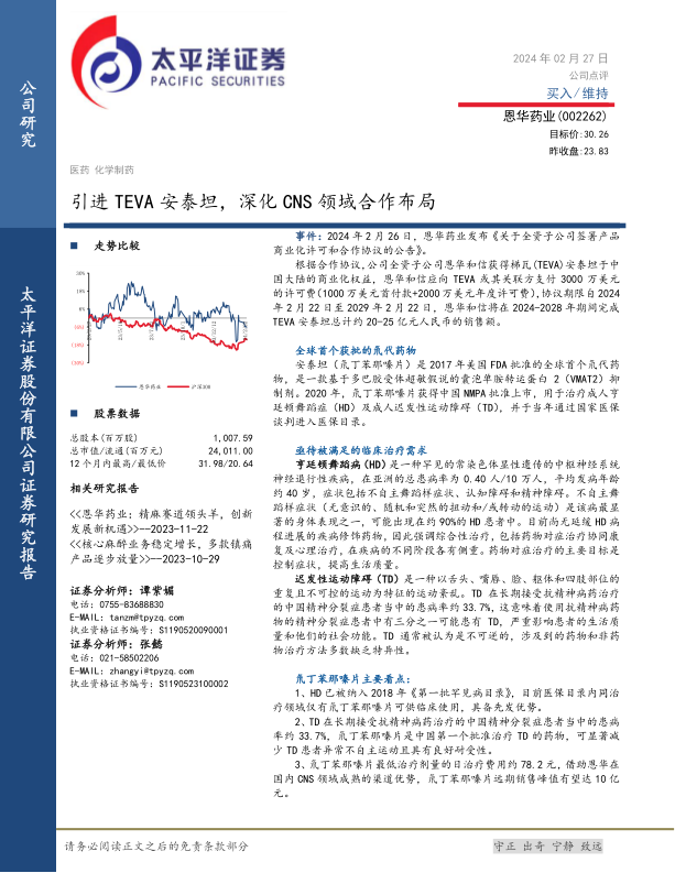 引进TEVA安泰坦,深化CNS领域合作布局