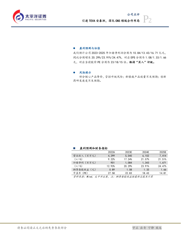 部分核心产品降价,管控升级风险;新镇痛产品放量不及预期;创新药研发进度不及预期。