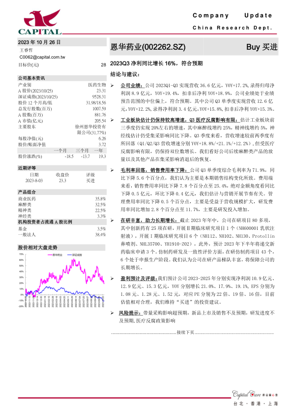 恩华药业2023年Q3业绩符合预期,工业板块保持增长势头,受医疗反腐影响较小。公司毛利率有所回落,但销售费用率显著下降。公司在研产品丰富,为长期增长提供动力。维持“买进”评级,但需关注带量采购、新品销售、研发进度以及医疗反腐政策等风险因素。