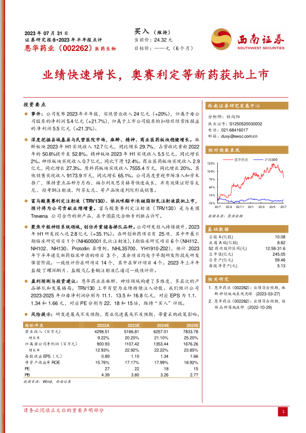 本报告对恩华药业(002262)2023年半年报进行了深度分析,核心观点如下:
