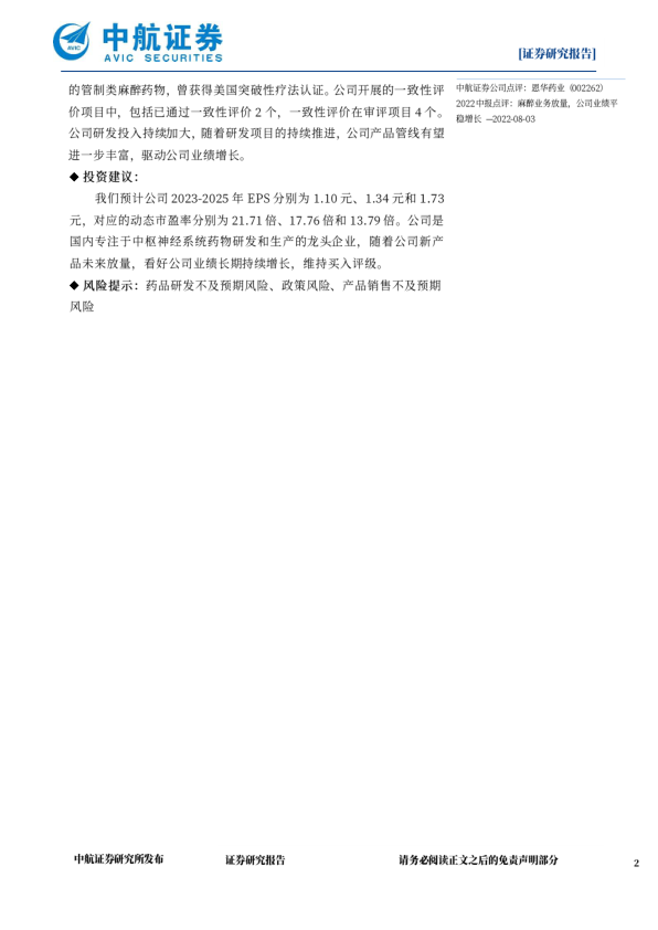 我们预计公司2023-2025年EPS分别为1.10元、1.34元和1.73元,对应的动态市盈率分别为21.71倍、17.76倍和13.79倍。公司是国内专注于中极神经系统药物研发和生产的龙头企业,随着公司新产品未来放量,看好公司业绩长期持续增长,维持买入评级。