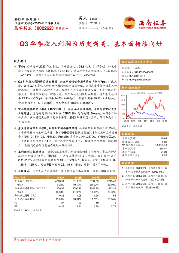 恩华药业2023年三季报显示公司业绩稳健增长,盈利能力持续提升。Q3单季收入利润创历史新高,销售费用率显著下降。公司在中枢神经系统领域深耕细作,创新药TRV130有望成为新的增长点。维持“买入”评级,但需关注研发、商业化以及政策风险。