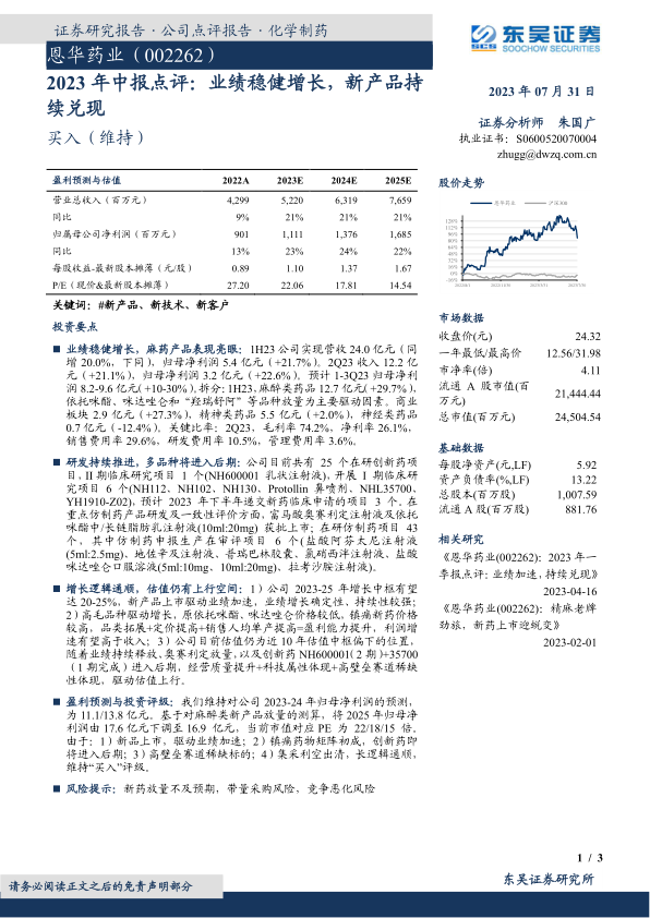 报告认为,恩华药业的增长逻辑清晰,新产品上市驱动业绩加速,盈利能力有望提升。目前公司估值仍处于近十年估值中枢偏下位置,随着业绩持续释放和创新药进入后期,估值有上行空间,维持“买入”评级。