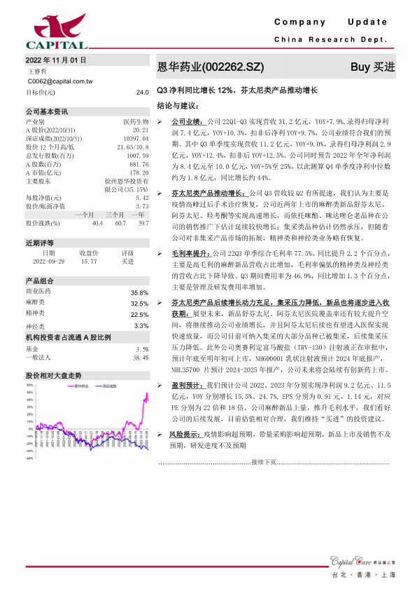 本报告对恩华药业2022年Q3业绩进行了分析,认为公司业绩增长主要受益于芬太尼类产品的推动和毛利率的提升。展望未来,公司在麻醉新品、创新药等方面具有增长潜力,集采压力也在降低。维持“买进”的投资建议,但需关注疫情、集采、新品上市和研发进度等风险因素。
