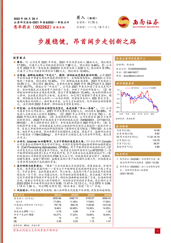 恩华药业在2021年及2022年一季度表现稳健,麻醉板块成为业绩增长的重要引擎。公司积极应对集采政策的影响,通过加强院内、院外销售模式和拓展新零售市场来提升市场占有率。同时,公司坚定地向仿创结合转型,加大研发投入,积极推进创新药的临床试验和仿制药的一致性评价。全球化战略也初见成效,通过License in方式引进海外创新药项目,并积极推动原料药及制剂的国际注册工作。综合来看,恩华药业在强管制、高壁垒的中枢神经系统药物领域具有较高的护城河,未来发展可期,维持“买入”评级。
