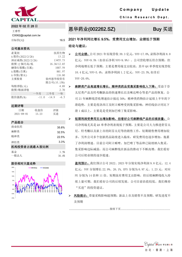 本报告分析了恩华药业2021年的业绩表现,指出公司营收增长符合预期,但净利润受费用支出影响低于预期。麻醉类产品成为增长引擎,而精神类和神经类药物受集采影响。报告预测公司未来两年净利润将显著增长,维持“买进”的投资建议,但同时也提示了集采和新品销售等风险。