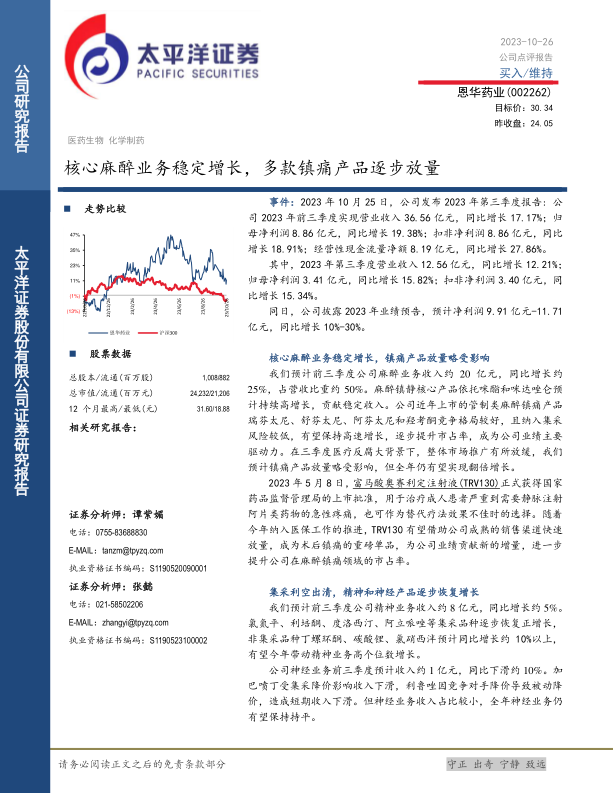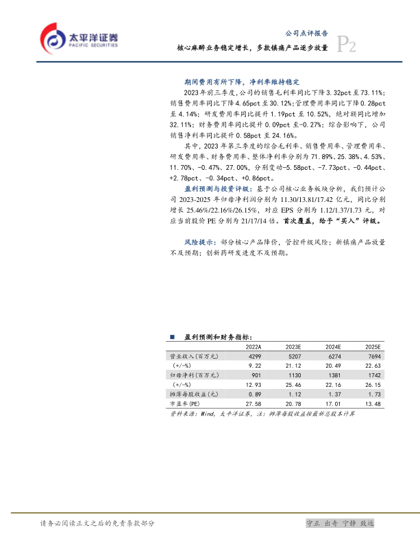 风险提示:部分核心产品降价,管控升级风险;新镇痛产品放量不及预期;创新药研发进度不及预期。
