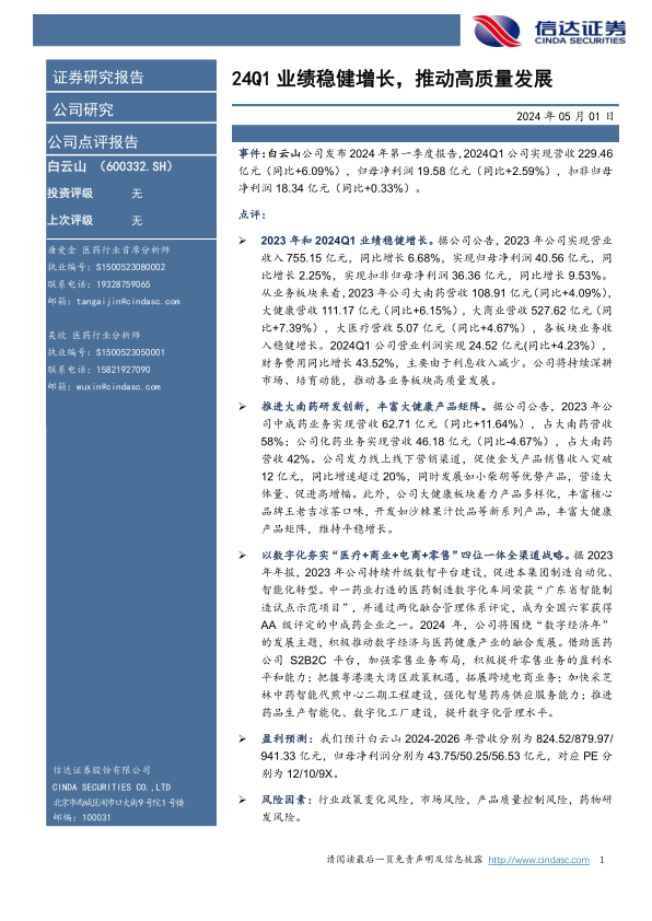 白云山24Q1业绩稳健增长,并通过大南药研发创新、大健康产品矩阵的丰富以及数字化战略的实施,持续推动高质量发展。公司在多个业务板块均实现了稳定增长,并积极拥抱数字化转型,提升整体运营效率和盈利能力。