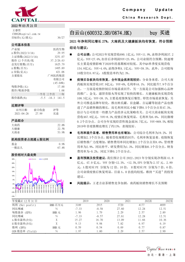 白云山(600332.SH/0874.HK)在2021年实现了显著的业绩增长,净利润同比增长27.6%,主要得益于疫情后大南药、大健康及大商业三大核心业务板块的全面恢复。公司盈利能力显著提升,经营性现金流表现优异,且当前A、H股估值均处于较低水平,具备投资吸引力。基于此,分析师维持对白云山的“买进”投资评级,并设定目标价为36元/27港元。