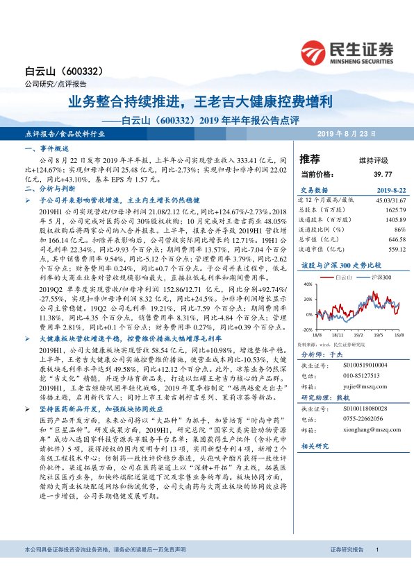 基于上述分析,民生证券研究院维持对白云山的“推荐”评级。
